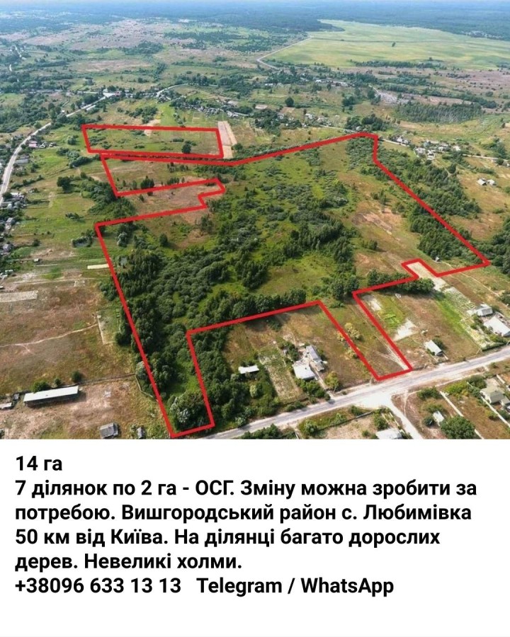 🟢 Продаж земельних ділянок | Київська область | с. Любимівка | 14 га (по 2 га) 🏞 Продаються 7 суміжних земельних ділянок по 2 га кожен 📍 Локація: Вишгородський район, село Любимівка 📏 Загальна площа: 14 га 📄 Призначення: ВГС (для ведення особистого сільського господарства) ⚡ Комунікації: Поряд лінія електропередач 10 кВ 🌳 Особливості ділянки: - Лісиста місцевість з природними височинами – Мальовнича природа, перспективи під еко-житло, агро- чи дачний комплекс – До Києва – ~50 км – Під'їзд – ґрунтова дорога, цілий рік проїзд можливий 📌 Можливості використання: – Поділ та продаж по 2 га - Інвестиції під майбутню забудову - Розробка котеджного селища – Сільськогосподарська чи рекреаційна діяльність 💰 Ціна: 130 000 дол за 14 га 📎 Кадастрові номери, схему ділянки та презентацію надам за запитом 📲 Пишіть у ЛЗ або дзвоніть: 097 196 26 82 📥 Також доступний в Telegram/WhatsApp 🗺️ Карта ділянки: [https://maps.app.goo.gl/cYzpZMUVfbrDuodYA] 📩 Інвестори та агентства - відкриті до співпраці